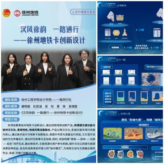 经过数轮激烈角逐,由我院谭丽娜老师指导,唐晓璇、杜若涵、吴怡、夏琳、吴靖宸五位同学组成的“一路同行队”凭借项目《汉风徐韵,一路通行——徐州地铁卡创新设计》,在两百多个参赛作品中脱颖而出,荣获人文价值提升赛道徐州市一等奖。