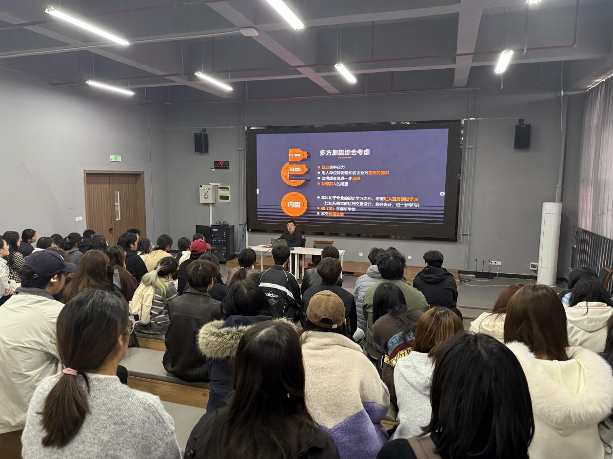 讲座中,三位老师围绕考研核心要点展开分享:顾行健老师分别从时间节点提醒、服务保障资源、近三年录取数据分析及建议几方面展开,详细介绍了学校和学院对考研学生的服务保障,鼓励同学们积极报考,通过往届数据分析,详解介绍了学院考研报考和录取的情况,提醒同学们合理选择院校,不盲目报考;苏旭老师则结合设计学科特性,重点分析了近年考研政策趋势与院校专业选择策略,详细列举了全国各地可以报考的院校,分析各地区学校的难易程度,建议同学们依据自身情况匹配目标,让同学们了解更多的报考院校的信息,帮助同学们选择院校;张超老师则是从专业准备和备考时间安排的角度,为同学们进行了备考的精准指导。他详细阐述了各阶段的复习重点、时间管理方法与专业创作能力提升路径。
