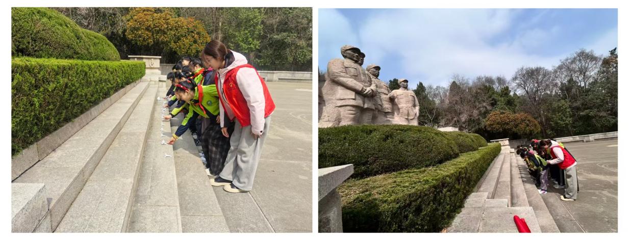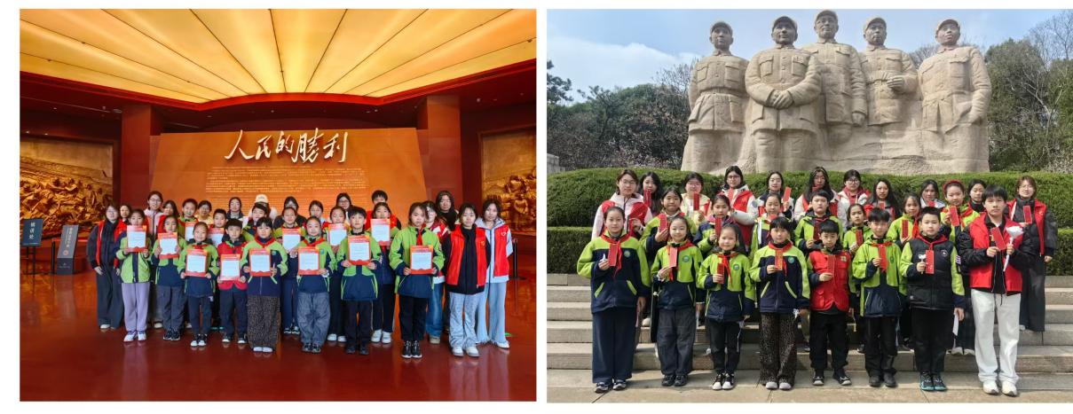 随后,师生共同前往淮海战役烈士纪念塔纪念馆,开展深度沉浸式教学与仪式教育。在纪念馆内,伴随着珍贵的历史文物与实景陈列,志愿者引导孩子们对照实物回顾英雄事迹。此时,大家现场填写《“人民之光”发现笔记》,用文字记录下在实物面前最触动心灵的红色瞬间,用简笔画描绘下心中的英雄形象。这一环节实现了历史实景与心灵感悟的深度共鸣,让孩子们更直观地感受到革命年代普通人的奉献与牺牲。填写完成后,全体师生在纪念塔前集中展示在校内完成的红色书签与公益誓言卡片,定格红色传承的温馨瞬间。志愿者结合孩子们的笔记与作品,现场引导他们回望历史、对话初心,进一步理清“历史中的光→今日公益心”的传承逻辑。
