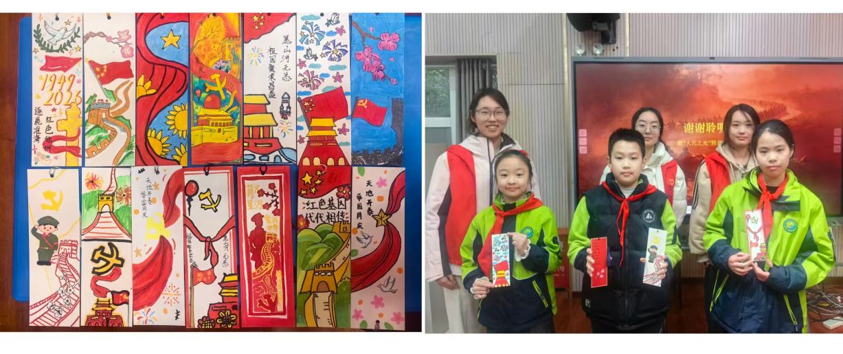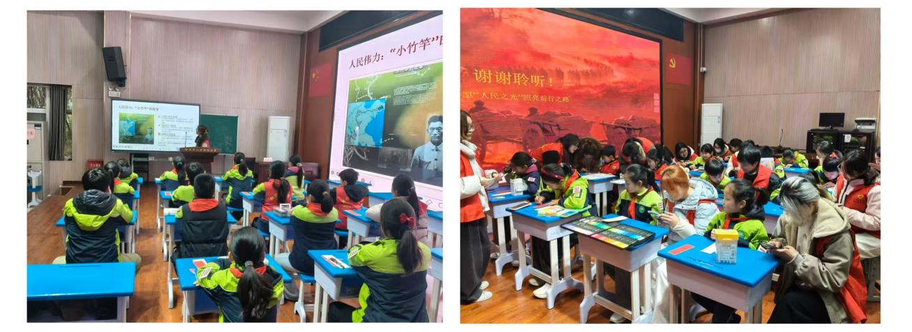 在青年路小学报告厅的课堂学习环节,志愿者们以生动的语言、丰富的历史图片和影像资料,为孩子们还原“小推车推出来的胜利”“支前民工冒炮火送物资”“野战医院医护人员救伤员”等感人至深的历史瞬间。一个个鲜活的英雄故事、一段段滚烫的奋斗记忆,让“人民之光”“公益初心”的种子悄然在孩子们心中萌发。随后,在志愿者的带领下,孩子们领取专属“寻光任务卡”,分组讨论并完成了红色书签创作与公益誓言撰写,在动手实践中深化了对红色精神的理解。