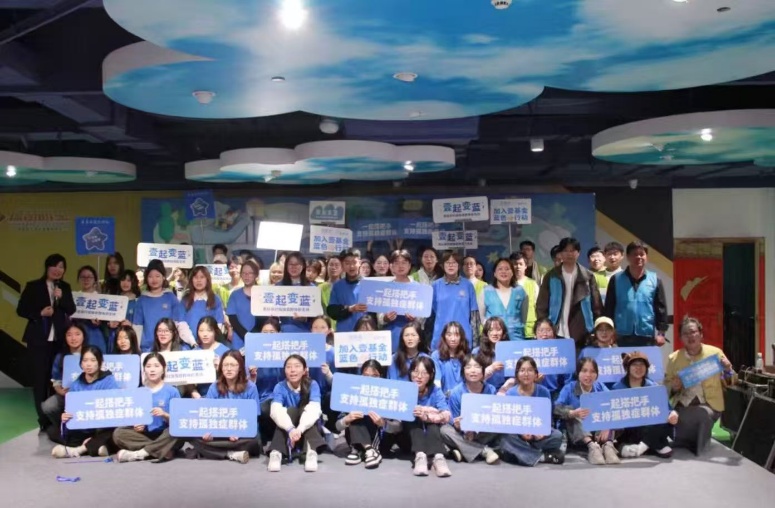 活动尾声,全体志愿者共同合影留念,大家手持“壹起变蓝”主题手牌,拉着“一起加入壹基金蓝色行动”的横幅,脸上洋溢着温暖的笑容,定格下这一充满爱的瞬间。此次志愿服务行动,帮助孤独症孩子们搭建了与社会沟通的桥梁,让更多人走进孤独症群体的世界,了解他们、接纳他们、关爱他们。